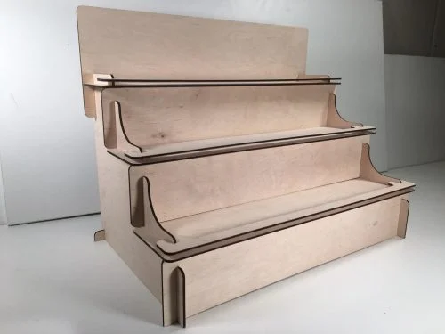 This sophisticated 3-tier display stand features a clean, minimalist design with three graduated shelves arranged in an ascending stepped configuration. The stand showcases precise laser-cut construction with smooth, curved shelf edges that create an elegant flowing appearance. Each tier is carefully proportioned to provide optimal product visibility while maintaining structural integrity. The design incorporates strategic cutout patterns and slots that enable easy assembly without the need for additional hardware. The back panel provides excellent stability and can serve as additional branding or display space. The natural wood finish visible in this prototype demonstrates the design’s versatility across different materials and aesthetic preferences.