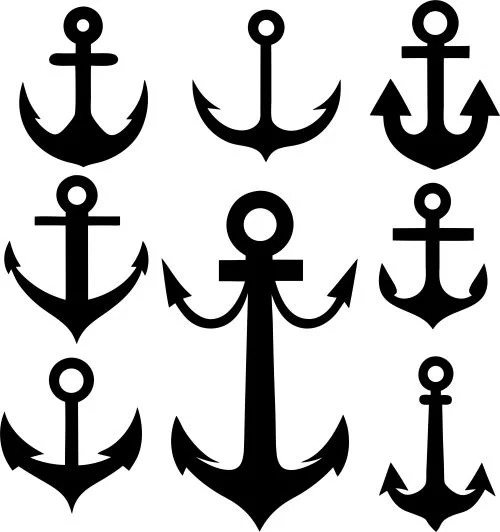 Each anchor design in this collection offers distinct visual characteristics while maintaining consistent cutting-friendly proportions. The designs feature solid black silhouettes with precise edges optimized for clean laser cutting without intricate internal details that could compromise structural integrity. The varied sizes within the collection allow for flexible project planning, from small decorative elements to statement pieces. The traditional maritime symbolism combined with contemporary design sensibilities makes this collection versatile for both classic and modern applications. All anchors maintain appropriate line weights and spacing for reliable cutting across different material thicknesses.