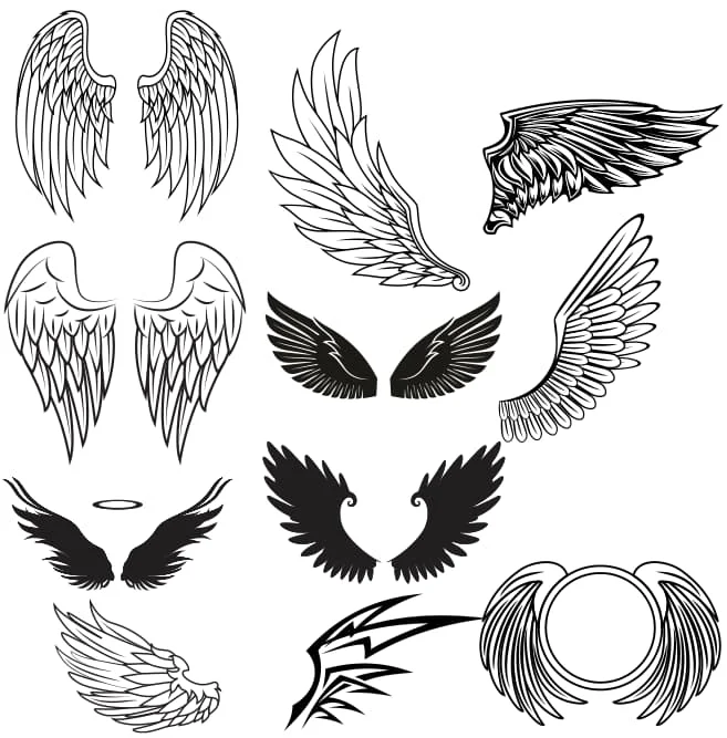 This comprehensive angel wings collection features over 40 meticulously crafted wing designs perfect for CNC laser cutting applications. The collection showcases a diverse range of wing styles including traditional feathered angel wings, dramatic bat wings, majestic eagle wings, and elegant decorative wing pairs. Each design displays intricate feather detailing with carefully rendered individual plumes, flowing curves, and natural wing proportions. The wings vary in size and complexity, from simple silhouette styles to highly detailed versions with elaborate feather patterns. Several designs feature symmetrical wing pairs positioned for easy cutting and assembly, while others present single wings that can be mirrored. The collection includes both outline and solid fill variations, providing versatility for different cutting applications and material thicknesses.