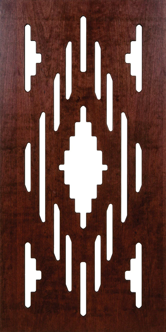 This stunning Art Deco vertical panel features an elegant geometric composition set against a rich mahogany wood background. The centerpiece showcases a distinctive diamond-shaped motif with stepped layers that create visual depth and dimension. Flowing organic lines cascade both above and below the central diamond, creating graceful vertical movement throughout the design. The corner elements feature sophisticated step-pattern details that echo classic Art Deco architecture. The entire composition is rendered in crisp white silhouette form, making it perfect for laser cutting applications. The design maintains perfect symmetry while incorporating both geometric precision and flowing organic elements that define the Art Deco style.
