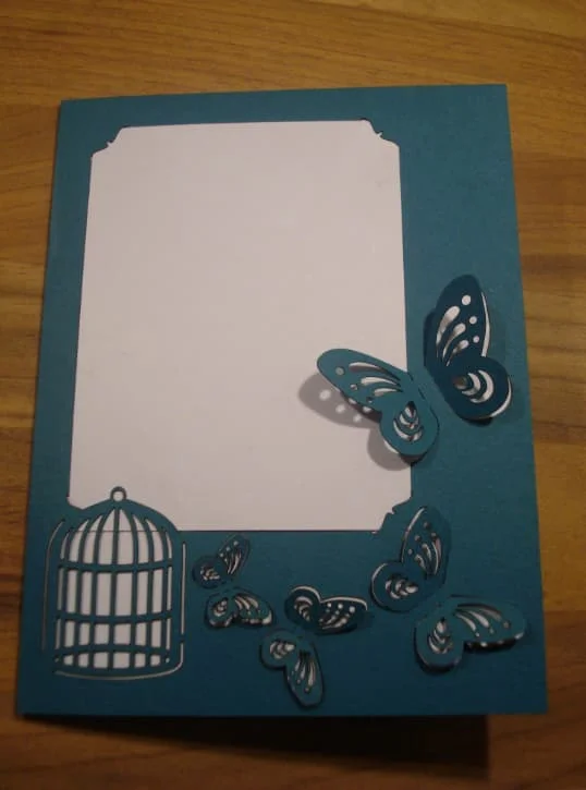 This elegant decorative frame features a sophisticated teal-colored design showcasing delicate butterflies and an ornate birdcage motif. The frame creates a beautiful border around a central white panel with gently curved corners. Multiple butterflies of varying sizes are artistically positioned around the frame, each featuring intricate wing patterns with detailed cutout designs. A vintage-style birdcage sits prominently in the lower left corner, complete with vertical bars and a domed top. The design combines nature-inspired elements with classic decorative styling, creating a harmonious composition perfect for laser cutting and CNC applications.