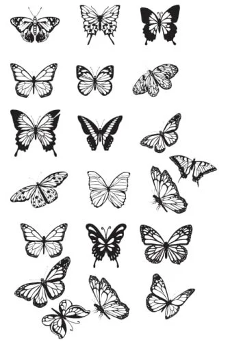 This exquisite butterfly collection features six distinct butterfly designs, each showcasing intricate wing patterns and decorative elements. The butterflies display varying sizes and styles, from delicate small specimens to larger ornate varieties with detailed wing structures. Each butterfly features symmetrical wing designs with elaborate internal patterns including dots, lines, geometric shapes, and organic flowing elements. The designs show precise line work with varying line weights that create depth and visual interest. Some butterflies feature eyespot patterns on their wings, while others display intricate lacework-like details. The collection includes both simple and complex butterfly forms, offering versatility for different project requirements and skill levels.