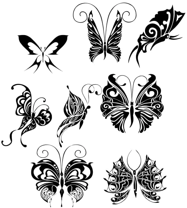 This stunning butterfly collection features eight distinct designs showcasing various artistic styles from tribal to ornamental patterns. Each butterfly displays intricate wing details with flowing curves, decorative swirls, and geometric elements. The designs range from simple silhouettes with elegant cutouts to complex tribal patterns featuring bold black sections and delicate line work. The butterflies vary in complexity, with some featuring symmetrical wing patterns, ornate antennae with spiral ends, and flowing tail extensions that add graceful movement to each piece.
