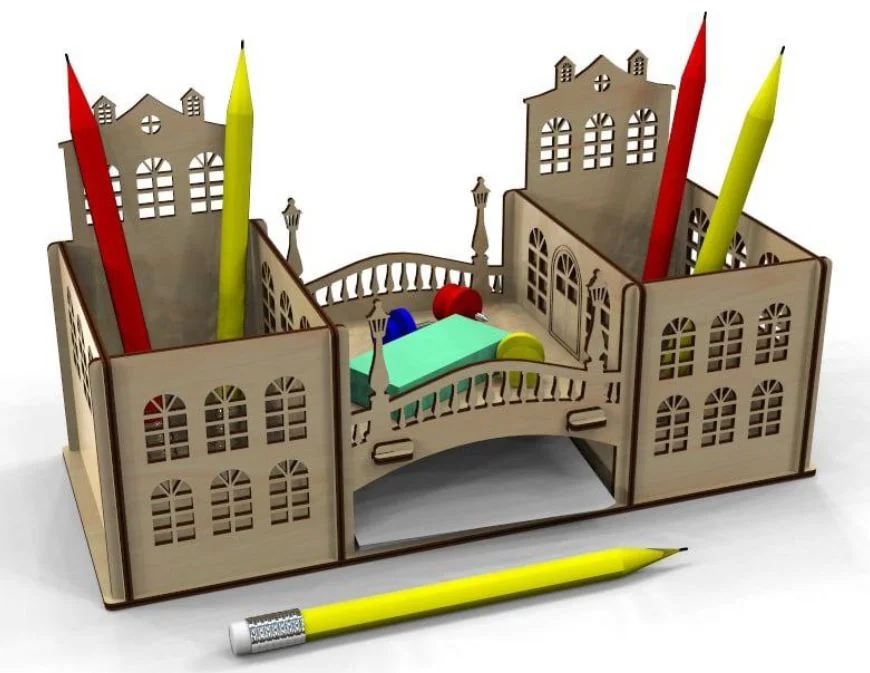 This Castle Bridge Pencil Holder Desk Organizer design is optimized for CNC laser cutting and comes in ZIP vector format. Cut it on wood, MDF, or acrylic using LightBurn, AutoCAD, or CorelDRAW for precise results.