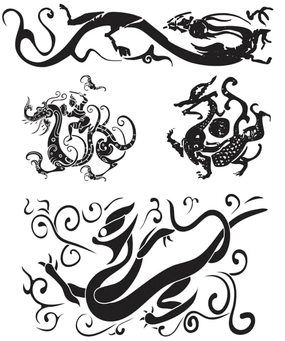This stunning collection features five traditional Chinese dragon silhouettes rendered in bold black outlines perfect for CNC laser cutting. The top design showcases an elongated serpentine dragon with flowing curves and graceful proportions, capturing the classic Eastern dragon aesthetic. The middle section presents two compact dragon designs – one featuring intricate flame-like details and decorative swirls, while the other displays a more robust dragon form with detailed scales and fierce expression. The bottom design depicts a dynamic dragon in motion with sweeping curved lines and ornamental flourishes surrounding the main figure. Each dragon design maintains authentic Chinese artistic elements including curved bodies, detailed claws, flowing whiskers, and traditional proportions that have been revered in Asian culture for centuries.
