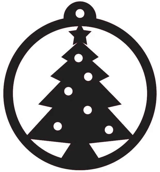 This Christmas ornament design stands out with its perfect symmetry and attention to traditional holiday elements. The tree features six decorative ball ornaments strategically placed to enhance visual appeal without overwhelming the design. The topping star adds the classic finishing touch that makes this unmistakably Christmas-themed. The circular frame provides structural integrity while maintaining an elegant appearance, and the integrated hanging hole ensures practical functionality. The clean lines and bold contrast make this design suitable for various materials and finishing techniques, from natural wood stains to painted finishes.
