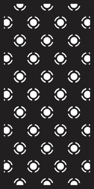 This sophisticated perforated panel design features a systematic arrangement of circular patterns across a rectangular format. The design showcases multiple rows of perfectly aligned circles, each crafted with segmented cutouts that create an elegant perforated effect. The top row displays semi-circular elements, while the main body contains full circular patterns with strategic gaps and solid sections. Each circle is designed with four symmetrical segments separated by clean lines, creating a modern geometric aesthetic. The overall composition maintains consistent spacing and proportional balance, making it ideal for architectural and decorative applications where both functionality and visual appeal are essential.
