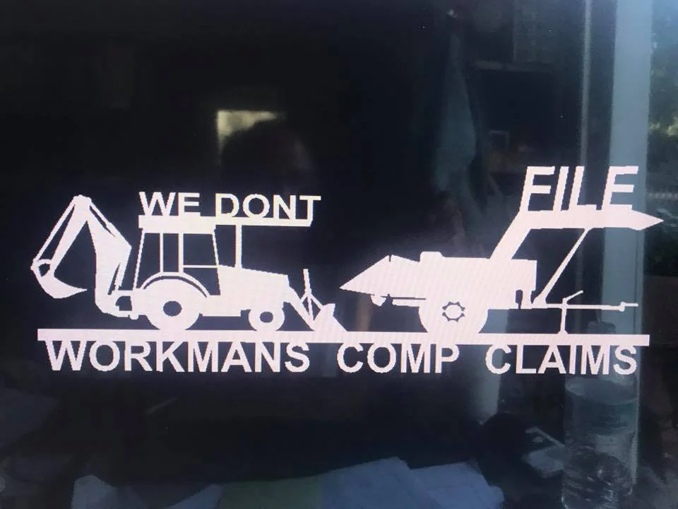 This professional construction-themed office sign features bold text reading “WE DON’T FILE WORKMAN’S COMP CLAIMS” with detailed silhouettes of heavy construction equipment. The design showcases a backhoe loader on the left side with clearly defined bucket, arm, and cab details, while the right side displays a dump truck with an elevated bed in dumping position. The text is arranged in a clean, readable layout with “WE DON’T” positioned above the backhoe, “FILE” above the dump truck, and “WORKMAN’S COMP CLAIMS” prominently displayed below both vehicles. The entire design is created as a single-layer cutting file with consistent line weights, making it perfect for CNC router and laser cutting applications. The balanced composition and professional typography create an eye-catching office sign suitable for construction companies, contractors, and industrial businesses.