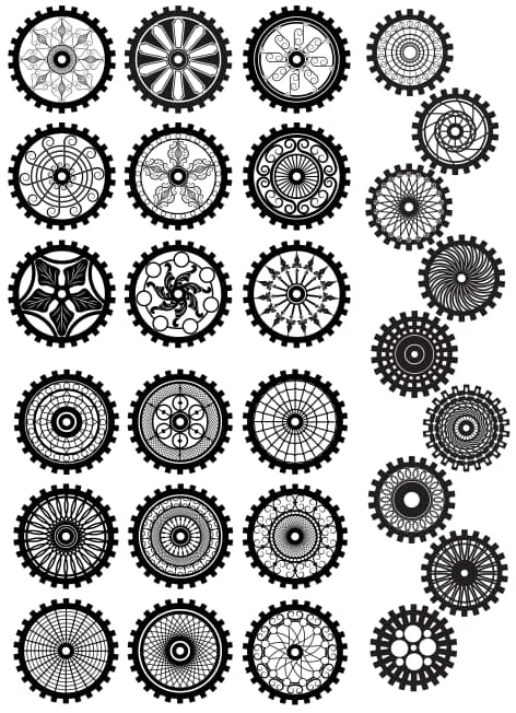 These gear designs stand out with their exceptional detail and variety in pattern complexity. Each design maintains the authentic gear tooth structure while incorporating unique decorative elements such as concentric circles, petal-like formations, and symmetrical geometric patterns. The collection includes both bold, statement-sized gears and smaller accent pieces, allowing for versatile arrangement possibilities. The intricate interior patterns range from simple radiating lines to complex mandala-inspired designs, ensuring there’s a perfect match for any project aesthetic or skill level.