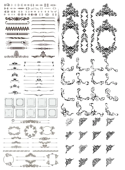 This comprehensive collection features an extensive array of decorative ornamental elements perfect for laser cutting and CNC applications. The design includes elegant baroque-style corner flourishes, intricate oval frames with detailed scrollwork, classical border elements, and versatile divider lines. The ornamental corners showcase flowing curves and traditional decorative motifs, while the central oval frames feature elaborate filigree patterns ideal for creating sophisticated focal points. Additional elements include geometric corner brackets, ornate dividers with varying complexity levels, and delicate flourish accents that can enhance any project with classical elegance.