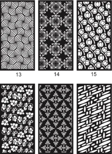 This stunning collection features six distinct decorative panel patterns, each showcasing unique artistic elements perfect for CNC laser cutting projects. Pattern 13 displays flowing wave-like curves creating an organic, contemporary feel. Pattern 14 presents an intricate floral motif with symmetrical blooms arranged in a repeating grid formation. Pattern 15 features overlapping circular elements creating a dynamic geometric composition. Pattern 16 combines delicate leaf and floral elements scattered across the surface in an elegant botanical arrangement. Pattern 17 showcases a sophisticated star-cross pattern with interconnected geometric shapes. Pattern 18 presents diagonal striped elements with varying angles creating a modern abstract design. Each panel measures in standard rectangular proportions ideal for room dividers, decorative screens, or wall art installations.