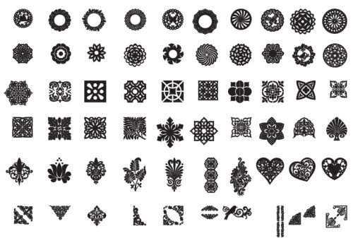 This comprehensive decorative patterns collection features 60 meticulously crafted ornamental designs arranged in a systematic grid layout. The collection showcases diverse artistic styles including intricate circular mandalas, geometric snowflake patterns, delicate floral motifs, ornate hearts, and sophisticated decorative elements. Each pattern demonstrates precise line work with varying levels of complexity, from simple circular frames to elaborate multi-layered compositions. The designs range from traditional ornamental styles to contemporary geometric interpretations, featuring detailed cut-out areas that create stunning visual depth when laser cut. The patterns are organized in rows, displaying consistent black silhouettes against white backgrounds for optimal cutting visibility.