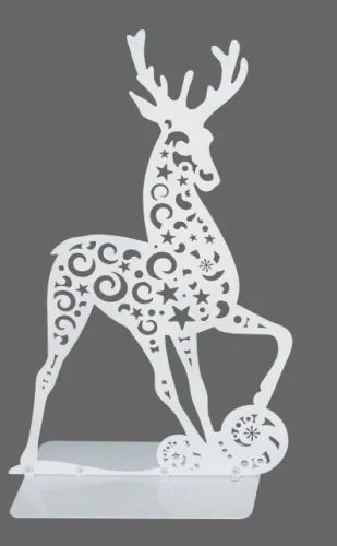 This exquisite decorative reindeer stand features an elegant silhouette of a standing reindeer with magnificent antlers, adorned with intricate ornamental patterns throughout its body. The design showcases flowing swirl motifs, delicate spiral elements, and charming star decorations that create a sophisticated filigree effect. The reindeer is positioned in a graceful standing pose with one front leg elegantly raised, mounted on a stable rectangular base that ensures perfect display stability. The entire design measures approximately 200mm in height, making it ideal for tabletop displays and decorative arrangements. The white cutout pattern against the contrasting background highlights every delicate detail of this artistic creation.