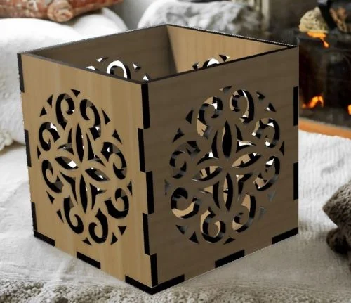 This elegant square lantern box features sophisticated ornamental scrollwork patterns laser cut into each of its four sides. The design showcases intricate curvilinear motifs with flowing scroll elements that create beautiful shadow patterns when illuminated from within. Each panel displays symmetrical decorative cutouts featuring graceful curves, spirals, and interconnected scroll designs that form an enchanting lacework effect. The box structure is designed with precision-fit tabs and slots for easy assembly without requiring additional fasteners. The warm brown finish visible in the example demonstrates how this design beautifully complements natural wood materials, creating an heirloom-quality decorative piece.