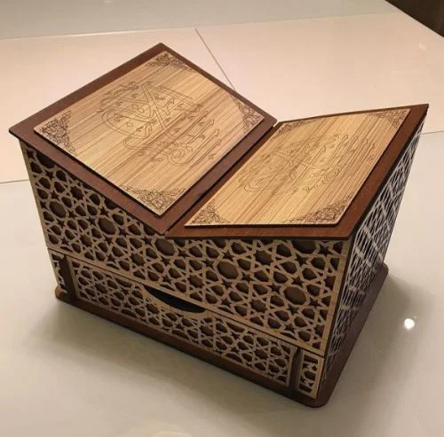 This exquisite decorative storage box features intricate Islamic geometric patterns laser cut into wooden panels. The design showcases a sophisticated hexagonal lattice pattern covering all four sides of the box, creating beautiful shadow play and visual depth. The hinged lid opens to reveal two compartments with engraved decorative elements and Arabic calligraphy or ornamental text. The box appears to be crafted from light-colored wood, possibly birch or maple, with precise laser-cut perforations that demonstrate the exceptional detail possible with CNC routing. The geometric pattern consists of interlocking six-pointed stars and hexagonal shapes, creating a mesmerizing repetitive design that’s both functional and artistic.