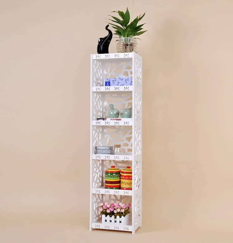 This elegant decorative storage shelf unit features intricate ornamental side panels with beautiful geometric cutout patterns. The tall, narrow design consists of five spacious horizontal shelves supported by elaborately detailed side panels that showcase repeating diamond and leaf-like motifs. The white lacquered finish highlights the delicate fretwork patterns, creating striking shadow effects when light passes through the cutouts. The unit stands approximately 6 feet tall with evenly spaced shelves perfect for displaying books, decorative items, plants, and storage containers. The ornate side panels transform a simple storage solution into an artistic furniture piece.