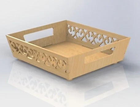 The standout feature of this design is the intricate ornamental side panels that transform a simple tray into an elegant home accessory. The symmetrical pattern ensures balanced aesthetics from all viewing angles, while the integrated handles provide practical functionality. The design optimizes material usage while maintaining structural integrity, and the decorative cutouts reduce weight without compromising strength. The flat-pack design allows for easy assembly and efficient material cutting, making it perfect for both hobbyists and commercial producers.