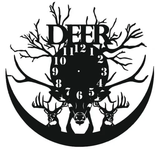 This stunning deer clock face design features an intricate silhouette of three deer heads positioned at the bottom of a circular frame, with magnificent antlers that transform into elaborate tree branches extending upward. The word ‘DEER’ is prominently displayed at the top center, integrated seamlessly with the branching antler design. Clock numbers from 1 to 12 are strategically placed around the circular perimeter, with the clock mechanism center point clearly marked. The design combines wildlife artistry with functional timekeeping, creating a perfect blend of rustic charm and modern aesthetics. The negative space creates beautiful contrast, making this design ideal for laser cutting applications.