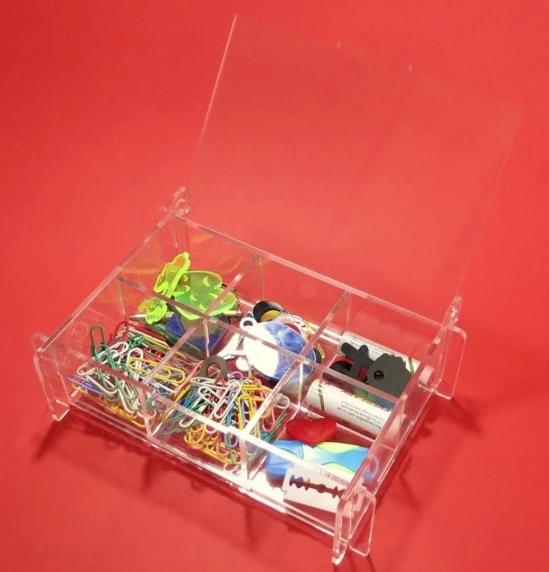 This sophisticated desktop organizer box features a transparent acrylic construction with multiple compartments designed for optimal office organization. The rectangular container showcases clean geometric lines with internal dividers creating distinct storage sections. The design includes a hinged lid mechanism and precise corner joints that demonstrate advanced CNC fabrication techniques. Each compartment varies in size to accommodate different office supplies, from paper clips and rubber bands to larger items like staplers and tape dispensers. The clear acrylic material provides excellent visibility of contents while maintaining a professional aesthetic that complements modern workspace environments.