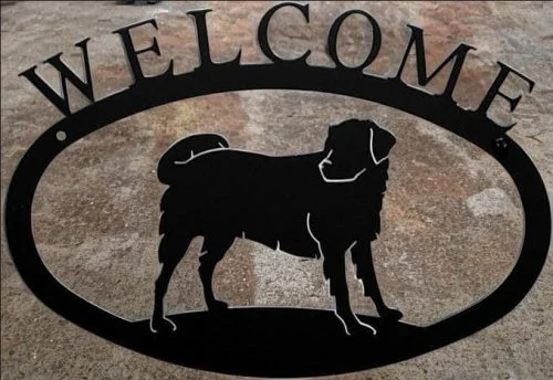 The design incorporates clean, bold typography that ensures maximum readability from a distance, making it perfect for entrance signage. The dog silhouette features smooth, flowing lines that capture the essence of a friendly retriever breed with distinctive ear shape and tail position. The oval frame provides structural integrity while maintaining an elegant appearance. All elements are optimized for CNC and laser cutting with appropriate line weights, no overlapping paths, and proper scaling ratios that maintain detail clarity at various sizes.
