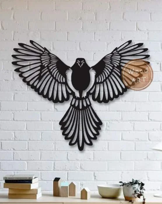 This stunning eagle wall art design features a majestic bird captured in a powerful spread-wing pose, showcasing intricate feather details and bold silhouette styling. The design displays symmetrical wings with carefully crafted individual feather segments that create depth and texture through negative space cutting. The eagle’s body forms the central focal point with a defined head and beak, while the expansive wingspan creates an impressive visual impact. The geometric approach to the feather patterns combines organic bird anatomy with modern laser-cut aesthetics, resulting in a design that works beautifully as statement wall art. Each wing contains multiple layered feather elements that create stunning shadow effects when mounted, making this piece ideal for contemporary and rustic interior designs.