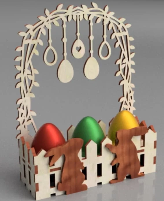 The design showcases exceptional attention to detail with its multi-layered construction that combines functional storage with decorative elements. The leaf-adorned arch creates visual depth while the hanging spoons add movement and interest to the overall composition. The basket’s compartmentalized design ensures eggs remain securely positioned, while the scalloped edges and geometric side panels provide both strength and aesthetic appeal. This three-dimensional assembly piece demonstrates sophisticated laser cutting techniques with precise interlocking components.