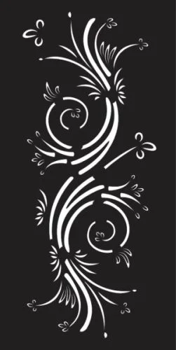 This stunning vertical floral ornament features an intricate arrangement of flowing swirls and decorative flourishes that create a sophisticated botanical motif. The design showcases elegant spiral elements that curve and twist gracefully throughout the composition, with delicate leaf-like extensions and ornamental details branching from the main swirling stems. The white design elements against the black background create a beautiful contrast that highlights every curve and detail. This ornamental pattern extends vertically, making it perfect for door panels, wall decorations, or architectural accent pieces. The flowing nature of the swirls creates a sense of movement and organic beauty that captures the essence of classical decorative arts.