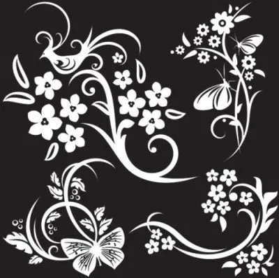 This exquisite floral butterfly ornamental design showcases an elegant collection of decorative elements featuring graceful butterflies, delicate flowers, and flowing vine patterns. The design displays intricate swirling motifs with beautiful five-petal flowers scattered throughout the composition. Each butterfly is carefully detailed with ornate wing patterns, while the curving vines create dynamic movement across the design. The ornamental elements are perfectly balanced, creating four distinct decorative sections that work harmoniously together. The white silhouette design against the dark background emphasizes the fine details and flowing curves, making it ideal for precision laser cutting and CNC machining applications.