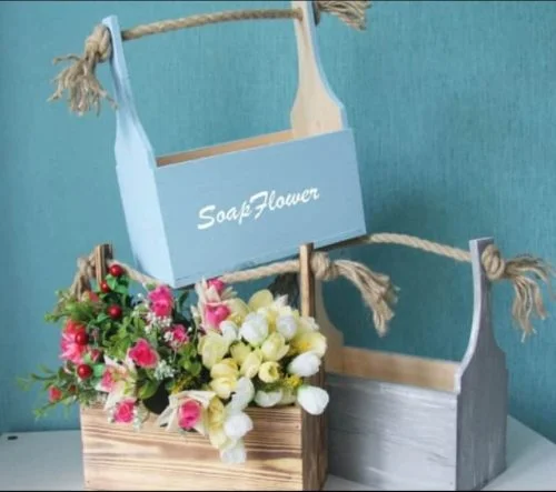 This charming flower basket planter design features a classic rectangular wooden construction with elegant rope handle details. The basket showcases clean geometric lines with paneled sides that create a rustic farmhouse aesthetic. The design includes precise cutouts for rope handles that thread through reinforced holes, creating an authentic basket appearance. The proportions are carefully balanced with a wide base for stability and sufficient depth for planting flowers or storing decorative items. The side panels feature subtle detailing that adds visual interest while maintaining structural integrity for various materials.
