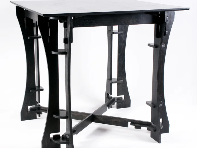 The standout feature of this design is its ingenious folding mechanism that requires no hardware or fasteners for assembly. Precision-cut interlocking joints ensure a secure connection between all components while allowing for easy disassembly. The curved leg design provides both aesthetic appeal and structural integrity, distributing weight evenly across the base. The flat-pack nature makes this design ideal for shipping, storage, and space-saving applications.