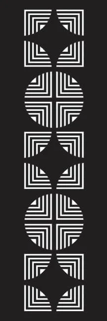 This striking geometric border pattern features a sophisticated vertical arrangement of alternating shapes that create a mesmerizing visual rhythm. The design consists of three distinct sections: square panels with diamond-shaped negative spaces created by concentric angular lines, and circular sections filled with radiating linear patterns that form cross-like intersections at the center. Each square section displays precise geometric layering with sharp, angular lines that spiral inward to create diamond voids, while the circular sections showcase perfectly symmetrical radial patterns. The entire design maintains a consistent width and demonstrates exceptional attention to geometric precision, making it ideal for creating elegant decorative borders and panel inserts.