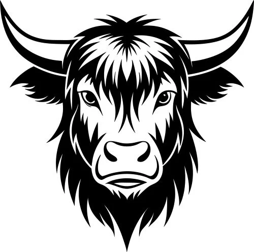 This striking highland bull head design showcases the majestic beauty of Scottish Highland cattle in a bold, artistic silhouette. The design features a powerful bull’s face with characteristic curved horns extending gracefully outward from the head. The most captivating element is the flowing, wavy hair that cascades around the bull’s face and neck, rendered in elegant curved lines that create depth and movement. The bull’s facial features include prominent round eyes, a distinctive bovine nose, and subtle detailing that captures the gentle yet strong expression typical of Highland cattle. The entire design maintains perfect symmetry and balance, making it ideal for laser cutting and CNC routing projects.