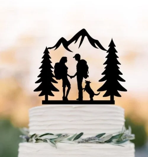 This design stands out with its perfect combination of romantic sentiment and outdoor adventure theme. The detailed silhouettes include realistic hiking gear, backpacks, and natural poses that convey movement and connection. The mountain range features multiple peaks with varying heights, creating visual depth and interest. The pine trees are intricately detailed with layered branches, while the dog silhouette adds a charming personal touch. The stable base ensures easy placement on cakes, and the overall proportions are optimized for standard cake sizes while maintaining structural integrity during cutting and assembly.
