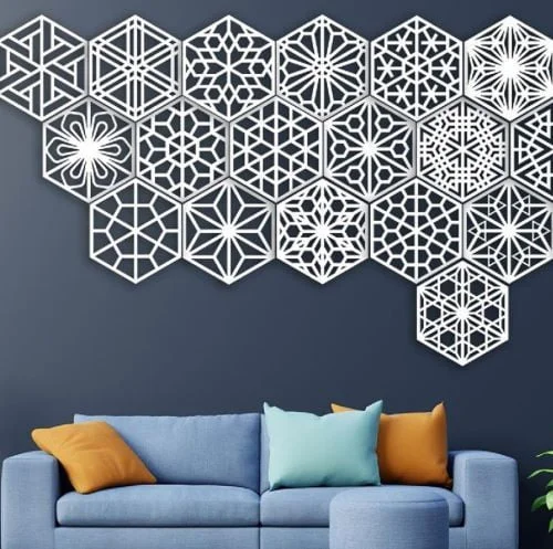 Create breathtaking Islamic-inspired wall art installations for homes, mosques, cultural centers, and meditation spaces. These hexagon panels work beautifully as room dividers, decorative screens, or accent walls. Perfect for wedding backdrops, restaurant decor, and boutique hotel interiors seeking authentic Middle Eastern ambiance. Use individually as wall medallions or combine multiple hexagons for large-scale installations. Ideal for gift shops selling cultural art, interior designers specializing in Islamic decor, and educational institutions teaching geometric mathematics. The modular design allows custom sizing for any space from small residential walls to large commercial installations.