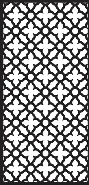 This stunning Islamic geometric pattern panel features an intricate repeating design that showcases the mathematical precision and artistic beauty of traditional Islamic art. The rectangular panel displays a sophisticated lattice of quatrefoil (four-petal flower) motifs interconnected by curved lines and circular nodes. The pattern creates a mesmerizing visual rhythm with alternating solid white quatrefoil shapes and circular elements set against bold black geometric framework. The design maintains perfect symmetry throughout, with each decorative element precisely positioned to create a harmonious overall composition that exemplifies the timeless elegance of Islamic geometric artistry.