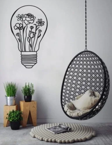 This innovative wall art design features a classic Edison-style lightbulb outline filled with beautiful botanical elements including flowers, stems, and leaves. The design combines the industrial aesthetic of a traditional incandescent bulb with the organic beauty of nature, creating a perfect metaphor for growth, ideas, and creativity. The lightbulb measures approximately 4-6 inches in height with detailed screw threads at the base and delicate floral patterns throughout the interior. The artistic composition includes various flower types with intricate petals, curved stems, and organic leaf shapes that flow naturally within the bulb’s rounded glass chamber, creating an elegant silhouette perfect for modern home decor.