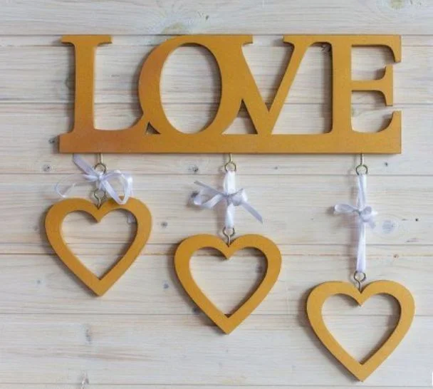 This charming decorative design features the word ‘LOVE’ in bold, elegant capital letters with three beautiful heart shapes suspended below on delicate ribbons. The main LOVE text serves as a horizontal mounting base with integrated hanging points, while three identical heart frames dangle gracefully underneath, each attached with white ribbon bows. The hearts feature hollow centers creating an attractive outline effect that adds visual lightness to the overall composition. The design maintains perfect symmetrical balance with the hearts evenly spaced across the width of the LOVE text. The warm golden-yellow color shown represents the natural wood tone that emerges beautifully when laser cut from quality materials.