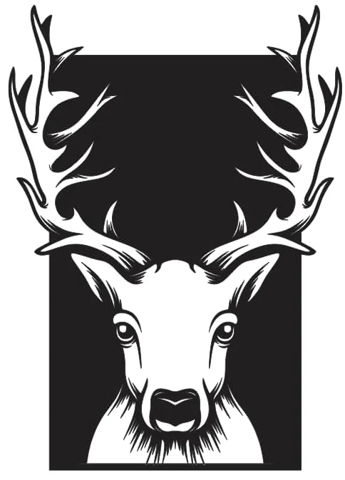 This striking deer head silhouette design features a magnificent stag portrait with an impressive set of branching antlers. The design is presented as a bold black and white contrast piece, with the deer’s head rendered in clean white against a dramatic black rectangular background. The antlers display intricate branching details with multiple tines extending upward and outward, creating a symmetrical crown-like formation. The deer’s facial features are elegantly simplified yet expressive, showing alert eyes, defined ears, and a gentle snout that captures the noble essence of this woodland creature. The overall composition is perfectly balanced and designed for optimal laser cutting performance.