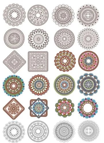 This comprehensive collection features 24 exquisite mandala designs showcasing intricate geometric patterns and symmetrical beauty. The designs range from simple circular patterns to complex multi-layered mandalas with detailed petals, radiating spokes, and ornate borders. Each mandala displays unique characteristics including floral-inspired motifs, concentric circles, diamond shapes, and decorative edge treatments. The collection includes both monochromatic line-art designs and colorful variations, demonstrating the versatility of these sacred geometric patterns. The designs vary in complexity from beginner-friendly simple circles to advanced intricate patterns with fine details perfect for precision laser cutting.