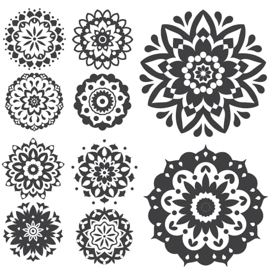 This comprehensive mandala flower collection features nine distinct circular designs arranged in an elegant layout. The collection showcases various mandala styles, from simple geometric patterns to complex multi-layered floral motifs. Each design demonstrates intricate symmetrical patterns with radiating petals, concentric circles, and decorative elements. The designs range from delicate outline patterns to bold solid-filled variations, offering versatility for different cutting preferences. The largest design on the right displays elaborate layered petals with detailed center rosettes, while smaller designs feature clean geometric divisions and traditional mandala symbolism. All designs maintain perfect radial symmetry with precisely calculated spacing between elements.
