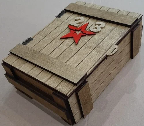 This authentic military ammunition box design features a distinctive rectangular storage container with weathered wood planking texture and military-style hardware details. The prominent red five-pointed star symbol sits centrally on the lid alongside the number “23”, creating an authentic military aesthetic. The design includes realistic hinges, corner reinforcements, and edge banding details that replicate genuine military surplus ammunition containers. The weathered wood grain texture adds character and authenticity to the overall appearance, while the clean geometric lines ensure precise laser cutting results across all panel sections.