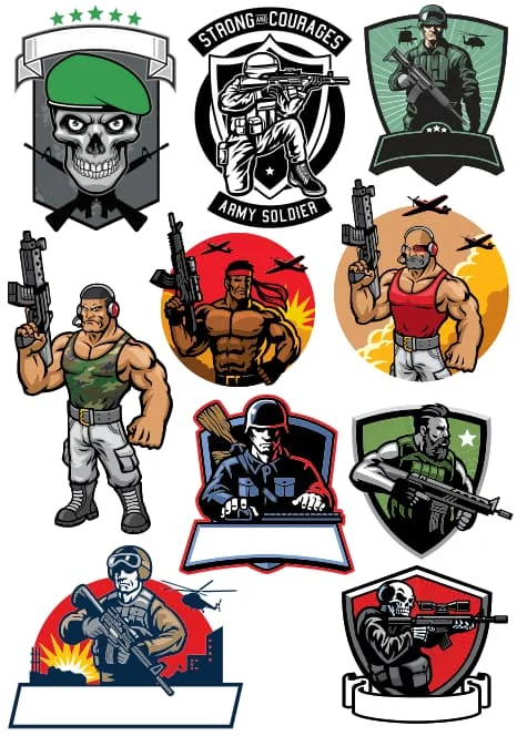 This comprehensive military army soldier badge collection features ten distinct tactical and military-themed designs perfect for CNC laser cutting projects. The collection includes various shield-shaped emblems, circular badges, and rectangular patches showcasing detailed military imagery. Featured designs include a skull wearing a military beret with crossed weapons, “Strong and Courageous Army Soldier” text with combat graphics, tactical soldiers in combat gear, muscular army characters with weapons, and various shield configurations with military themes. Each design incorporates authentic military aesthetics with bold lines, clear details, and professional styling suitable for precision cutting. The artwork combines traditional military symbolism with modern tactical elements, creating versatile designs for multiple applications.