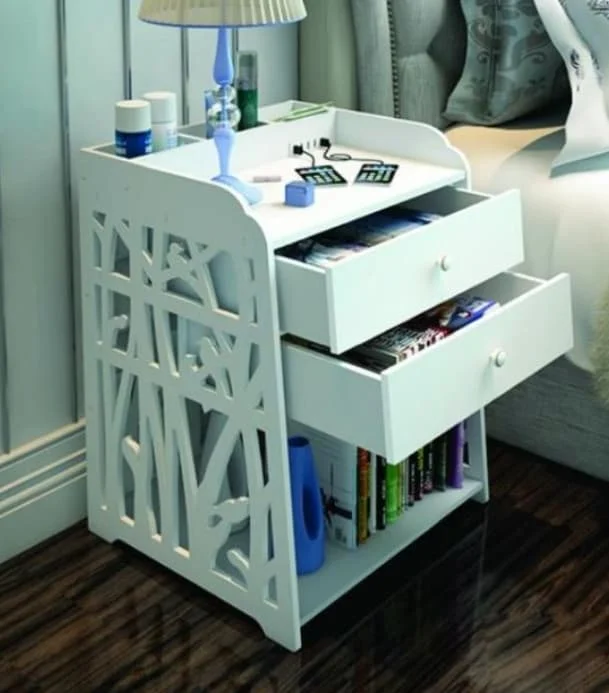 This sophisticated modern bedside table design features a clean white finish with multiple functional storage solutions. The nightstand showcases two pull-out drawers with sleek handles and an open bottom compartment perfect for storing books and magazines. The design incorporates decorative side panels with geometric cutout patterns that add visual interest while maintaining structural integrity. The flat-pack design allows for easy assembly and efficient material usage. The table surface provides ample space for bedside essentials like lamps, phones, and personal items. The overall dimensions are perfectly proportioned for standard bedroom furniture, making it an ideal addition to any modern bedroom decor.