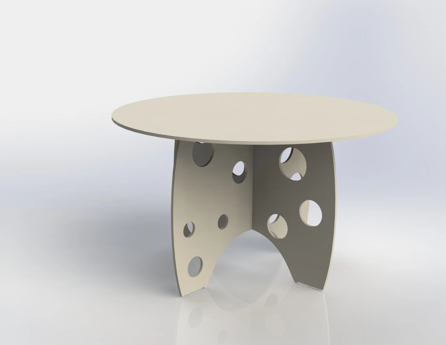 This innovative side table design features a distinctive Swiss cheese aesthetic with randomly placed circular holes throughout the base structure. The table consists of a smooth circular top surface supported by two interlocking curved panels that form a stable X-shaped base. The support panels showcase an organic pattern of various-sized circular cutouts, ranging from small decorative holes to larger openings that create visual interest and reduce material weight. The design maintains perfect symmetry while offering a playful, modern interpretation of traditional furniture construction. The clean lines and geometric approach make this piece suitable for contemporary interiors, while the unique hole pattern adds character and functionality through weight reduction and material efficiency.