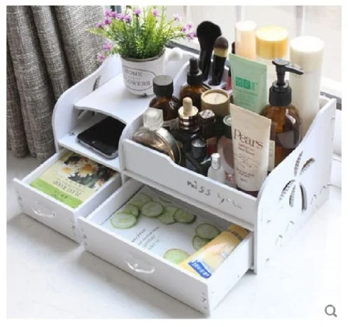 The design showcases multiple storage compartments of varying sizes to accommodate different cosmetic items from small containers to tall bottles. The pull-out drawer system provides easy access to stored items, while the decorative side panels featuring intricate scrollwork patterns add visual interest. The curved handle cutouts ensure comfortable operation, and the stable multi-tier construction maximizes vertical storage space while maintaining a compact footprint perfect for bathroom countertops or vanity areas.