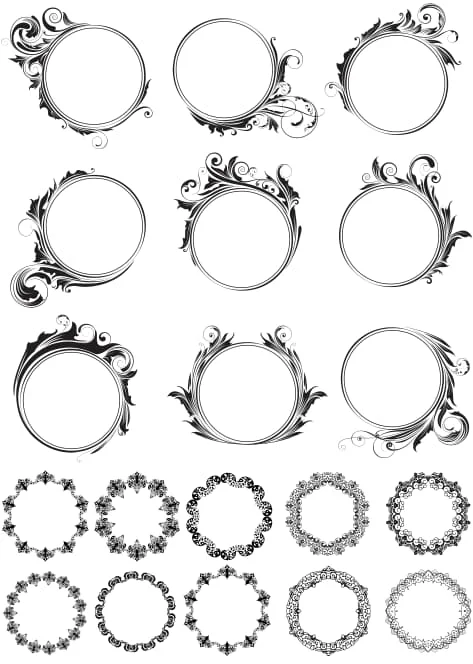 This comprehensive collection features 19 exquisite ornamental circle frames showcasing elegant baroque and Victorian-inspired decorative elements. The top section displays 9 sophisticated circular frames adorned with flowing flourishes, delicate swirls, and organic vine-like patterns that gracefully extend beyond the circular boundaries. Each frame measures approximately 100-150mm in diameter, with intricate scrollwork and ornamental details that create stunning visual depth. The bottom section presents 10 additional circular frames featuring repetitive pattern borders including floral motifs, geometric elements, and traditional decorative chains that form perfect rings with varying levels of complexity and artistic sophistication.