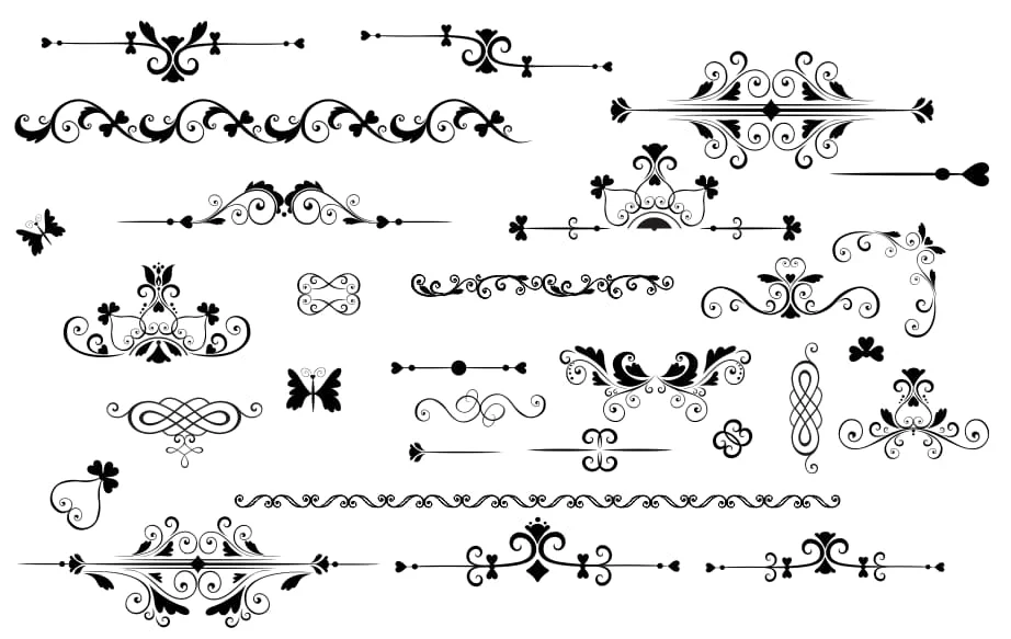 This comprehensive ornamental borders collection features an elegant array of decorative flourishes and scrollwork elements perfect for laser cutting and CNC machining. The design includes multiple ornate border styles with intricate swirls, vintage-inspired scrollwork, and classical decorative motifs. Each element showcases delicate curves, symmetrical patterns, and ornamental details that create sophisticated decorative accents. The collection contains various border lengths from corner pieces to full linear borders, featuring traditional European-style ornamentation with flowing lines and botanical-inspired curves that add timeless elegance to any project.