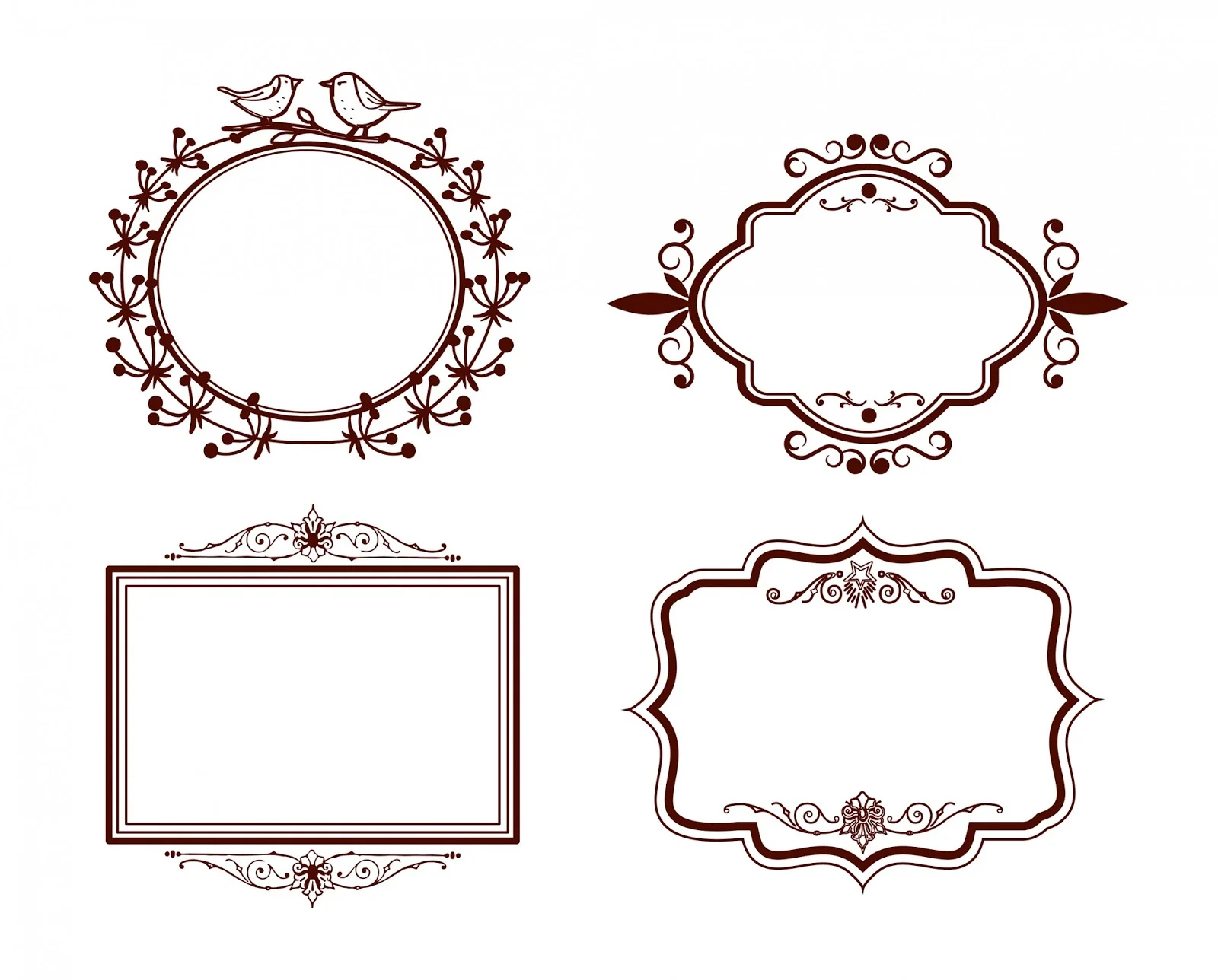 This comprehensive collection features 32 exquisitely crafted ornate decorative frames showcasing a diverse range of classical and baroque-inspired patterns. The design sheet displays frames in various shapes including circular, oval, rectangular, square, and ornamental shield forms. Each frame exhibits intricate detailing with flowing scrollwork, floral motifs, geometric borders, and elegant filigree patterns. The designs range from delicate lace-like borders to bold architectural elements, featuring symmetrical compositions that demonstrate masterful attention to detail. These frames incorporate classic design elements such as acanthus leaves, rosettes, decorative corners, and ornamental flourishes that exemplify timeless elegance and sophisticated craftsmanship.