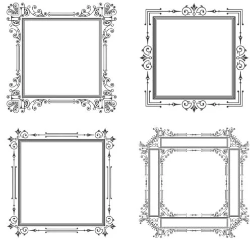 This exquisite collection features four distinct ornate decorative frames, each showcasing unique baroque and classical design elements. The top-left frame displays elaborate scrollwork with floral motifs and intricate corner flourishes that create a sense of Victorian elegance. The top-right frame presents a more geometric approach with linear borders and symmetrical ornamental details positioned at the center of each side. The bottom-left frame combines both geometric precision and organic flowing elements, featuring corner decorations that balance structure with artistic flair. The bottom-right frame exhibits the most elaborate baroque styling with densely packed ornamental details, scrolls, and decorative elements that create a luxurious appearance suitable for premium applications.