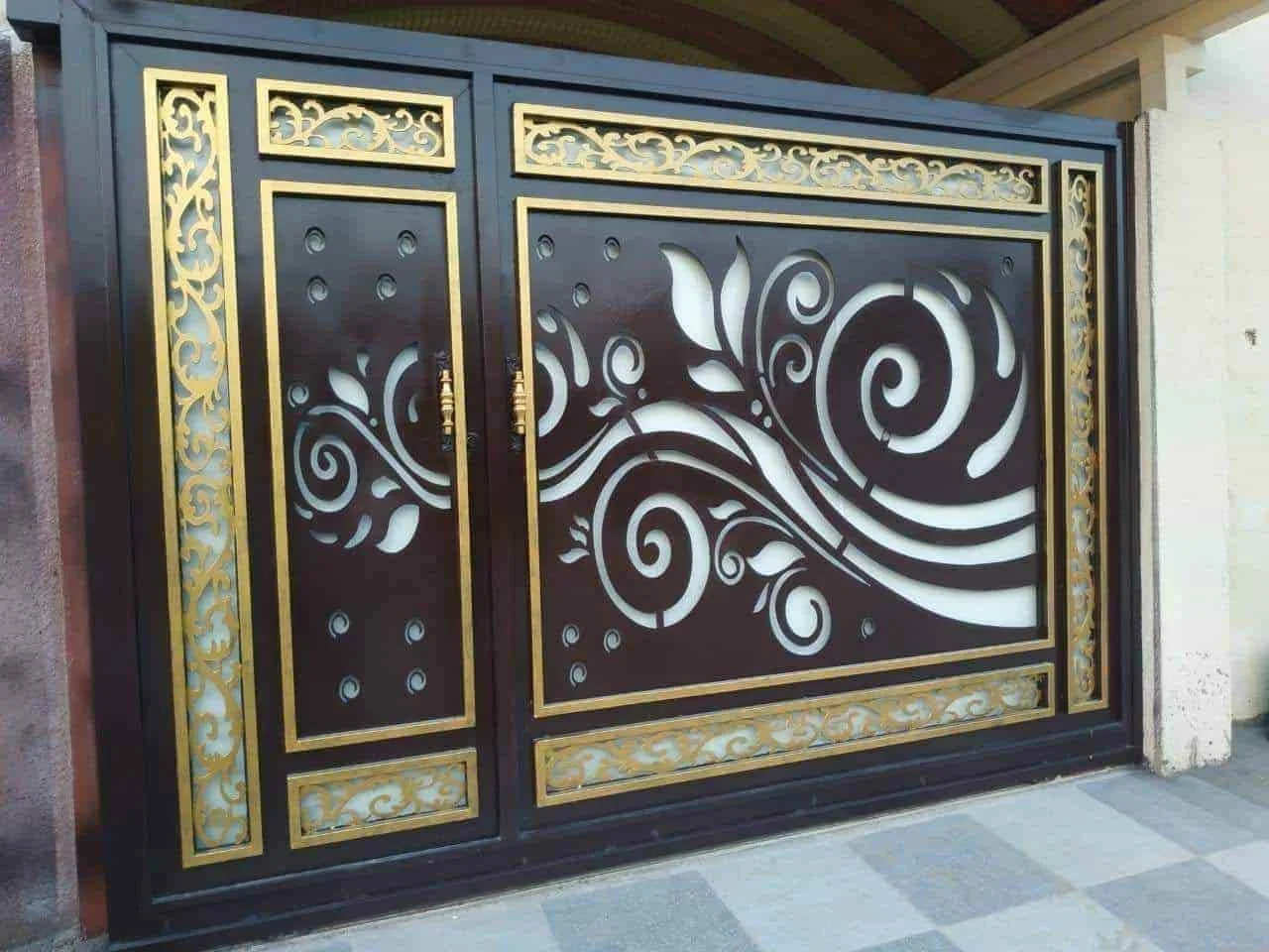 This exquisite ornate gate design showcases a masterful combination of flowing swirl patterns and decorative geometric borders. The main panel features large, elegant spiral motifs with graceful curves that flow organically across the surface, creating a sense of movement and sophistication. The design incorporates smaller accent swirls and leaf-like elements that complement the primary patterns. Golden decorative borders frame the entire composition with intricate geometric patterns that add depth and luxury to the overall design. The gate features both solid panels and open decorative sections, creating a perfect balance between privacy and visual appeal. The rich burgundy and gold color scheme demonstrates how this design will look stunning when cut from premium materials.